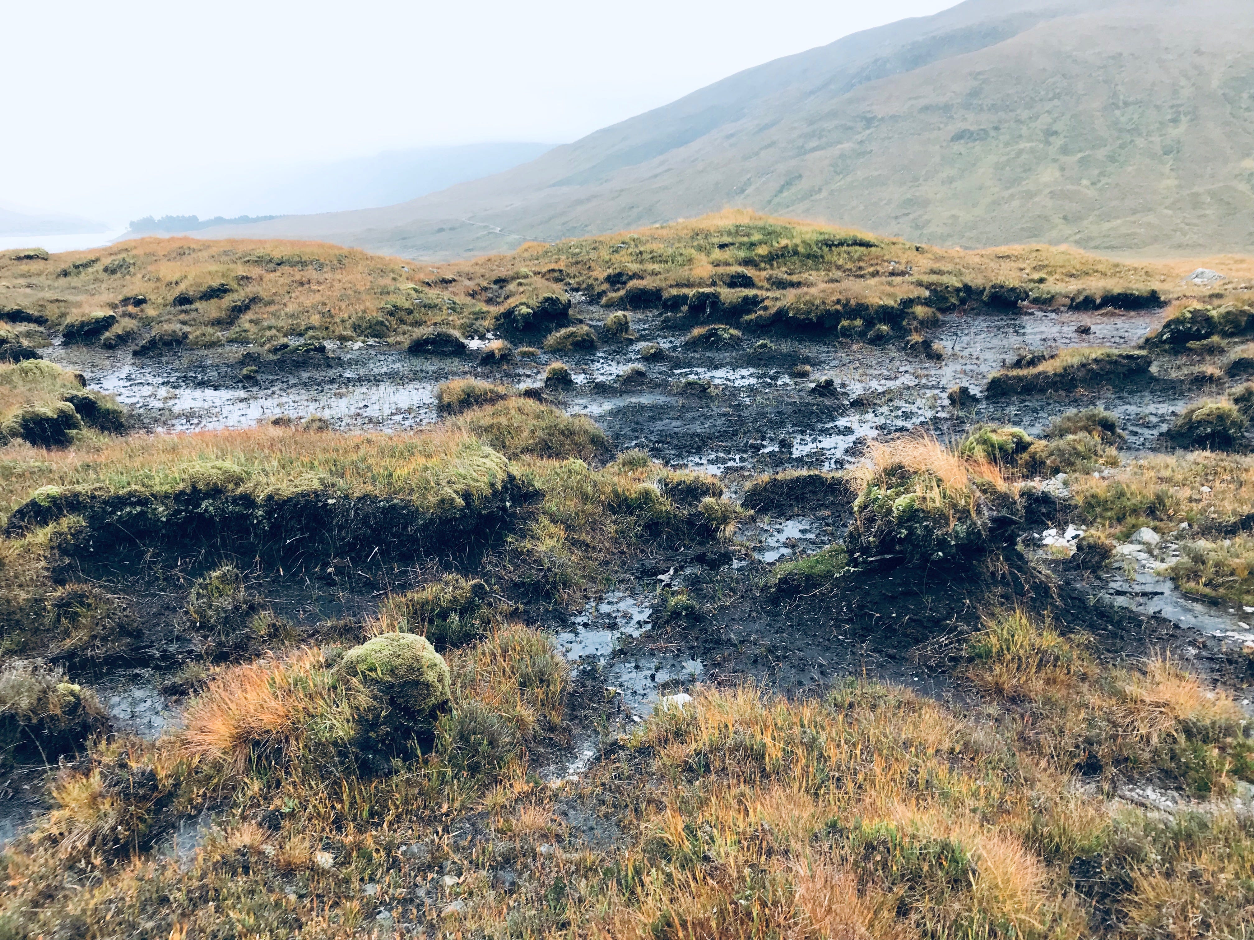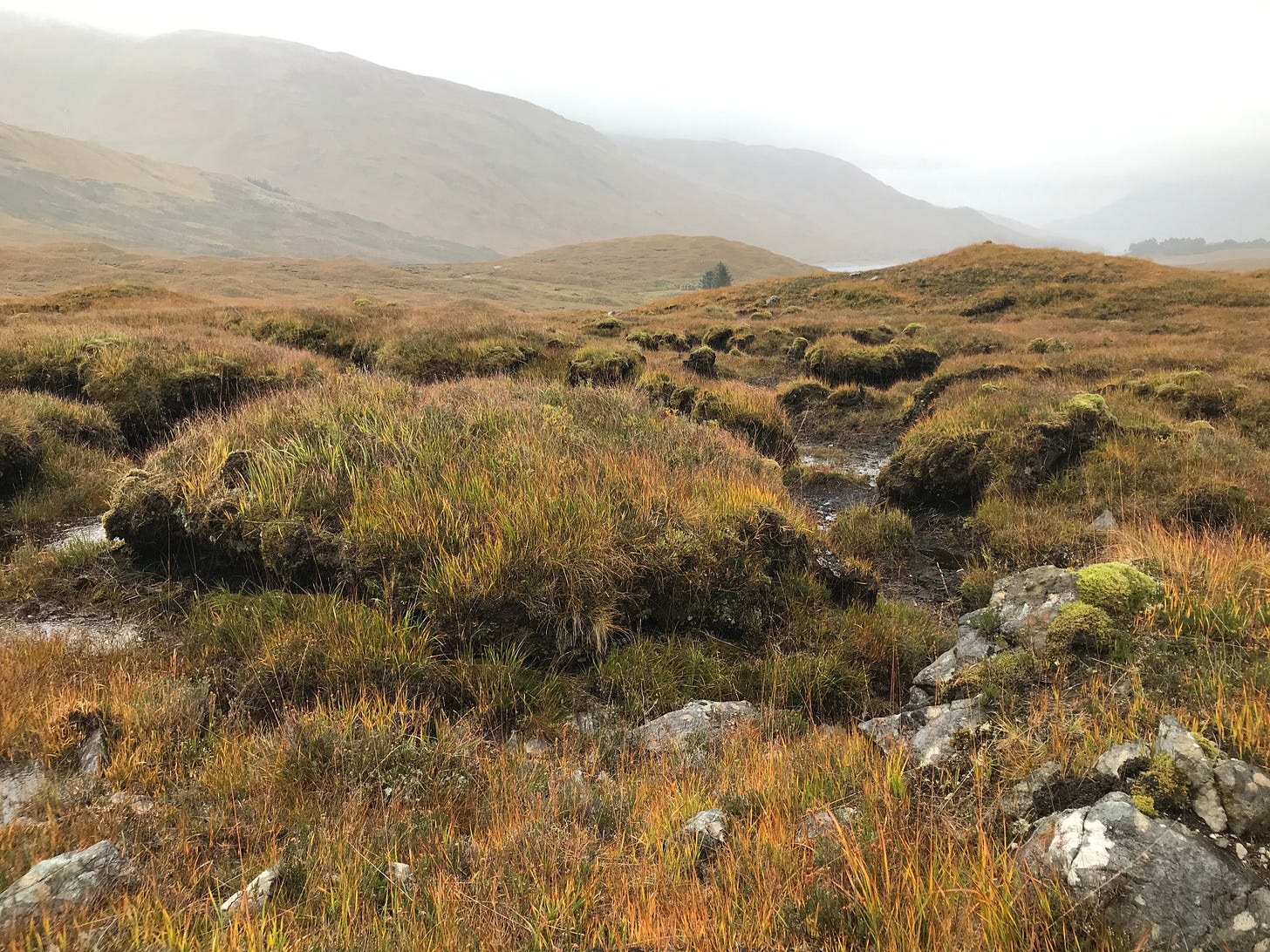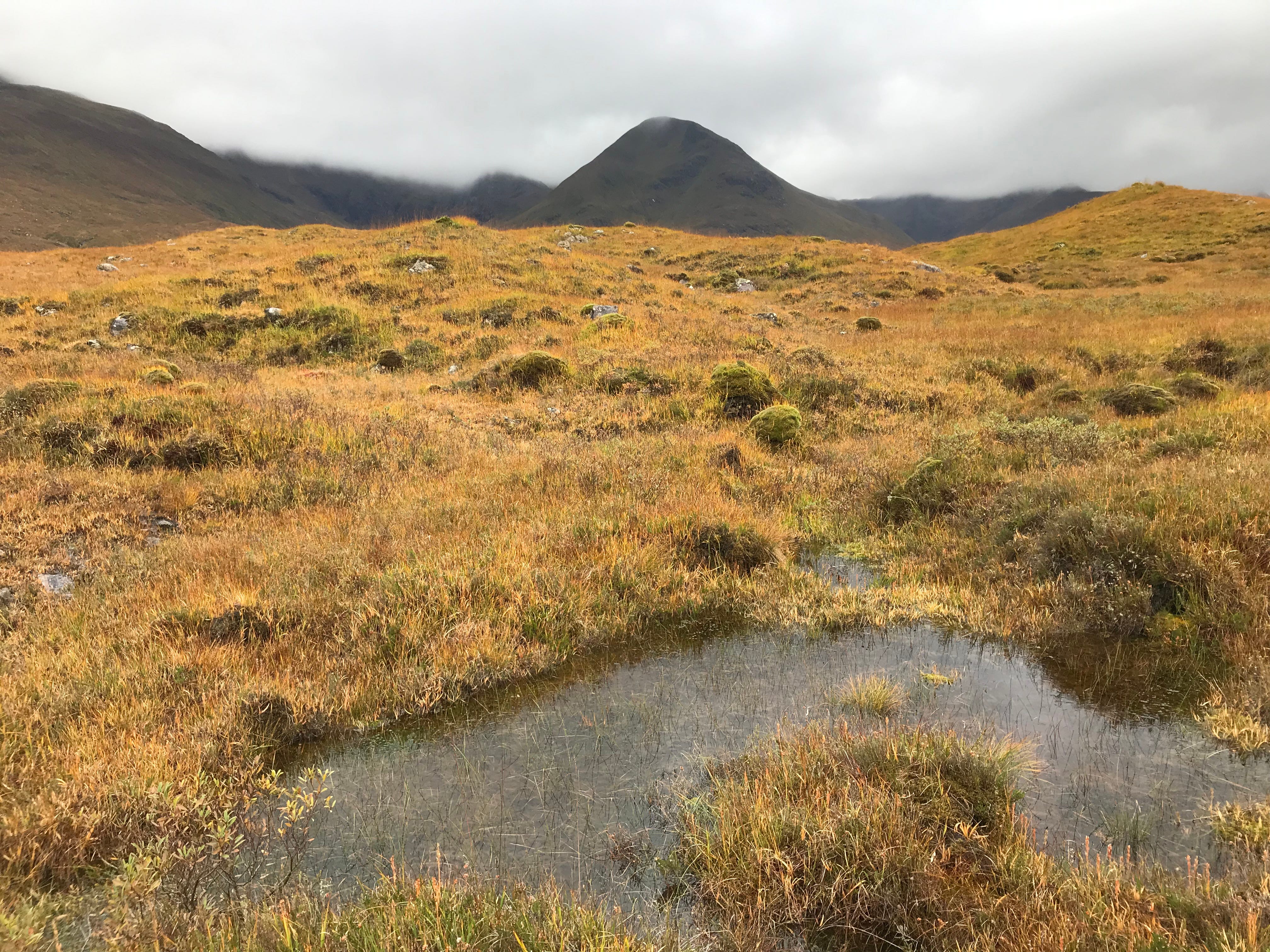 The sound of mountain water gushing down was all around me, the gentle rain was refreshing. I looked down and the road and cars far below were like something out of a model railway landscape, the vast loch beyond disappearing into the thick mists. Little mountain plants of red, peach and yellow, mosses and grasses of pale green, dark green and gold peppered the ground, but there was not a bird to be seen or heard. Slabs of grey rock broke up the green in places, while the sky was fast becoming blacker. A fighter jet shot past, obliterating the peace.